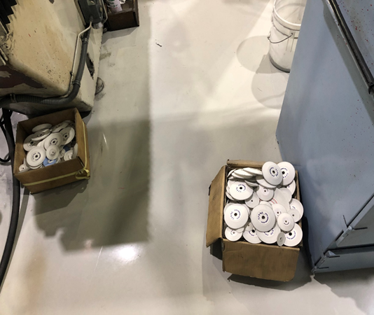 使用済みの砥石が段ボールに入れられ、第三者から見て要、不要の判断がつきません。