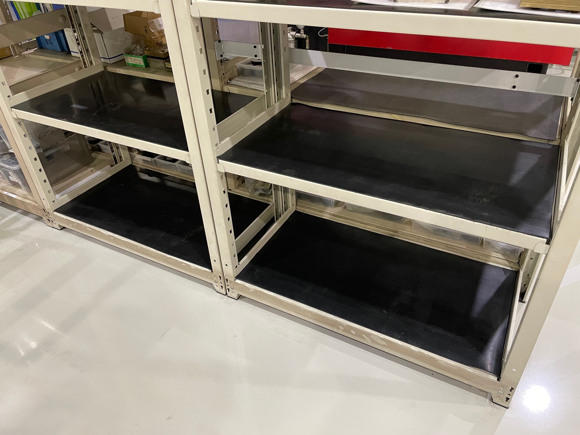 ②ゴムマットを敷き、滑り防止、仕掛品を衝撃から守る