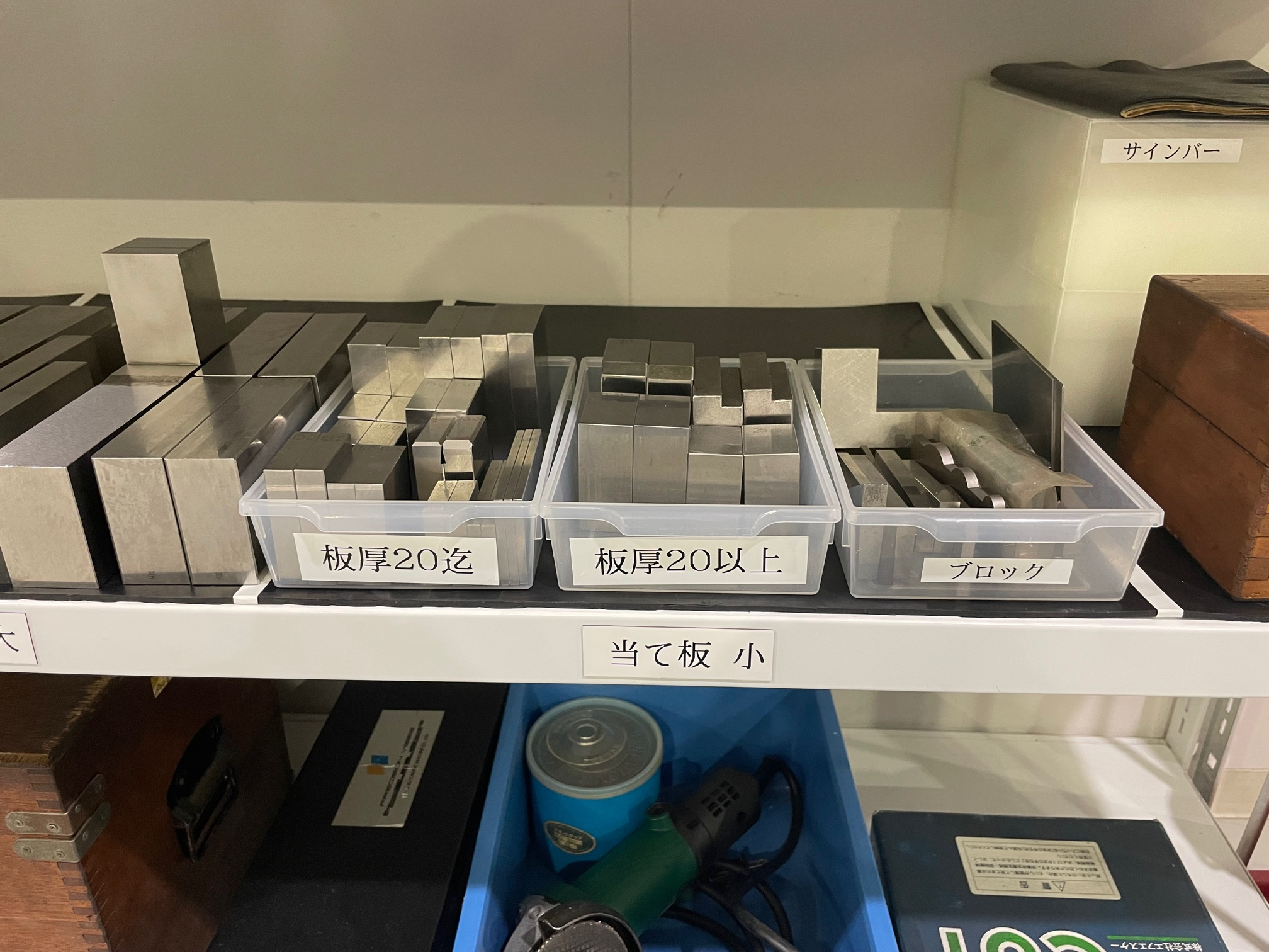 当て板は大きさで区分けし、当て板の厚さが一目で分かるように板厚寸法を刻印しました。