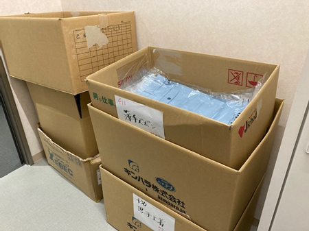 新品の作業服が納品時の箱に入れられたままの状態です。